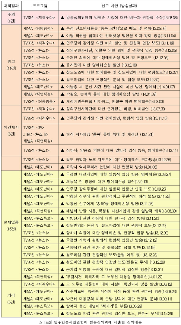 지난 2013년 12월 철도노조의 파업이 벌어지자 TV조선과 채널A 뉴스 프로그램은 또다시 친정부․여당 성향의 패널을 출연시켜 철도노조의 파업을 부정적으로 언급하거나 때로는 원색적인 비난을 쏟아내는 방송을 내보냈다. 민언련이 이와 관련해 7건의 심의를 제출했는데 그중 3건은 권고 혹은 의견제시, 4건은 문제가 없다고 결정되거나 기각됐다. 문제는 심의에 일관성이 없다는 것이다. 심의위원들은 ‘귀족노조’, ‘철밥통 지키기’ 등의 표현을 사용하며 철도노조를 비하한 내용에 대해서 어떤 때는 자극적인 표현이라며 ‘권고’를, 어떤 때는 ‘문제없음’이라고 결정했다. 또 철도노조 관계자 혹은 철도노조 파업을 옹호하는 사람이 한명도 나오지 않은 채 일방의 의견만을 반영한 것을 심의해달라는 내용에 대해서는 ‘언론에 이미 노출된 내용’ 이라거나 ‘출연자 개인의 의견’이라는 이유로 심의조차 하지 않았다.