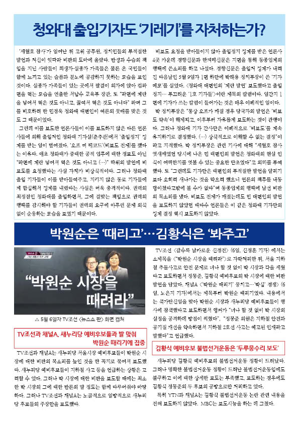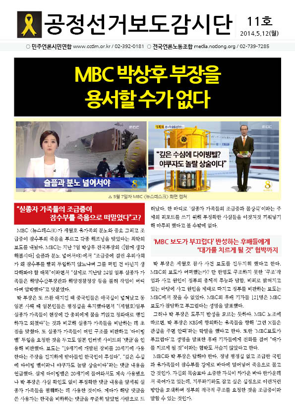 공정선거보도감시단 11차보고서 PDF 파일(2014.5.12)민주언론시민연합과 전국언론노동조합은 지난 2월 24일 지방선거 D-100일을 맞아 ‘공정선거보도감시단’을 출범했습니다.