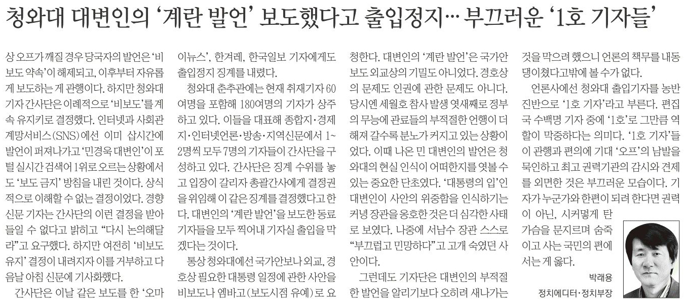 박 정치부장은 “통상 오프가 깨질 경우 당국자의 발언은 ‘비보도 약속’이 해제되고, 이후부터 자유롭게 보도하는 것이 관행이다. 그러나 청와대 기자 간사단은 이례적으로 ‘비보도’를 계속 유지하기로 결정했다. (…) 상식적으로 이해할 수 없는 결정”이라고 지적했다. 박 정치부장은 관련 기사에 대해 “세월호 참사 엿새째였던 당시에 나온 민 대변인의 발언은 청와대의 현실 인식이 어떠한지를 엿볼 수 있는 중요한 단초였다”고 의미를 부여했다. 또 “그런데도 기자단은 대변인의 부적절한 발언을 알리기보다 오히려 새나가는 것을 막으려 했으니 언론의 책무를 내동댕이쳤다고밖에 볼 수가 없다”며 동종업계의 행태에 날선 비판의 목소리를 냈다.