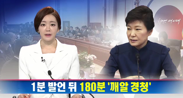 채널A <1분 발언 뒤 180분 ‘깨알 경청’>(13일, 이현수 기자)는 제목처럼 깨알같이 박근혜 대통령을 부각시켰다. 앵커는 “박 대통령은 오늘 3시간 동안 국무위원들의 허심탄회한 생각을 경청했습니다”라고 말하고, 기자도 “약 세 시간 동안 국무위원 전원이 앉은 순서에 따라 의견을 내놨고, 박 대통령은 묵묵히 들으면서 메모에 집중한 것으로 알려졌다”고 언급했다.
