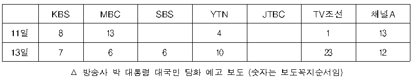 박근혜 대통령 담화가 발표될 예정이라는 예고 기사가 별다른 내용도 없이 계속되고 있다. 예고 수준을 넘어서 KBS <박 대통령 ‘대국민 사과․안전 시스템 개혁’ 담화>(11일, 단신), MBC <“많은 의견 수렴 대국민 담화”>(13일, 윤지윤 기자)처럼 이미 담화가 발표된 듯한 보도 제목도 있다.