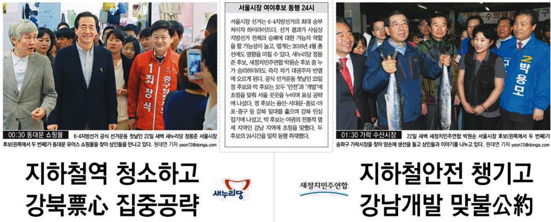 이런 맥락에서 중앙일보 23일자 종합면에 실린 사진 기사는 시사하는 바가 크다. 정몽준, 박원순 후보를 나란히 배치한 사진은 겉으로 보기엔 큰 무리가 없어 보인다. 정 후보는 안전모를 쓰고 있고 박 후보는 손을 흔들며 환하게 웃고 있는 모습이었다. 그러나 사진 기사의 제목과 내용을 보면 상황이 달라진다. 제목은 <헬멧 쓴 정몽준…배낭 멘 박원순>이었다. 세월호 참사 뿐 아니라 최근 서울시에서는 지하철 사고가 발생해 그 어느 때보다 ‘안전’이 최대 화두로 떠오르고 있는 요즘, 제목만으로도 정 후보는 안전을 챙기는데 반해 박 후보는 매우 한가해 보인다. 사진 설명도 가관이다. “22일 서울시장 선거에 출마한 새누리당 정몽준 후보는 강북, 새정치민주연합 박원순 후보는 강남에서 지방선거 공식 선거운동을 시작했다. 정 후보가 성산대교 철골구조 하부를 돌아보며 다리 안전을 살피고 있고, 배낭을 멘 박 후보는 삼성동에서 시민들에게 인사하고 있다”가 사진 설명 내용이다. 정 후보에게는 강북의 안전을 챙기는 후보 이미지가, 박 후보에게는 강남에서 여유로운 시간을 보내는 후보 이미지가 풍겨져 나온다.