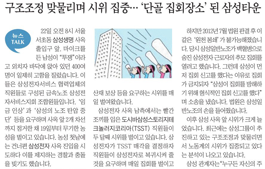 단 한건도 보도하지 않은 신문은 국민일보, 동아일보, 서울신문, 조선일보, 중앙일보, 문화일보이다. 사안을 외면하고 모른척 하는 것보다 더 심각한 왜곡보도도 있다. 조선일보는 고인의 죽음은 아무 상관도 없다는 듯 사옥 앞 시위로 인해 시끄럽다는 기가 막힌 보도를 실었다. 조선일보는 <구조조정 맞물리며 시위 집중… 단골 집회장소 된 삼성타운>(5/23, B3면, 김승범 기자)이라는 제목의 기사에서 “22일 오전 8시 서초동 삼성생명 사옥 출입구 앞, 마이크를 든 남성이 “투쟁”이라고 외치자 바닥에 앉아 있던 400여 명이 일제히 고함을 질렀습니다. 이들은 삼성전자서비스 협력업체의 직원들로 구성된 금속노조 삼성전자서비스지회 조합원들입니다. ‘임금 인상’과 ‘삼성의 노조 탄압 중단’등을 요구하며 사옥 앞 2개 차선까지 점거한 채 19일부터 무기한 농성을 벌이고 있습니다”라고 운을 띄웠다. 이 보도에서는 삼성 사옥 앞 시위는 언급하지만 염 씨의 자살과 삼성전자서비스의 행태에 대해서는 전혀 언급하지 않았다. 그저 노동자들의 파업으로 서초동 삼성 사옥 인근이 시끄럽다는 점에만 초점을 맞춘 것이다. 노동자 한명이 열악하고 불안정한 노동여건에 시달리다가 노조를 결성한 뒤에는 불이익으로 인한 박봉과 노동탄압으로 스스로 죽음을 택했다. 고인이 원한 장례마저 치르지 못한 채 경찰에 의한 시신탈취까지 당했다. 이런 상황에서 함께 일하던 노동자들이 벌이는 시위를 어떻게 이렇게 한가하게 표현할 수 있을까. 한마디로 패륜적 보도이다.