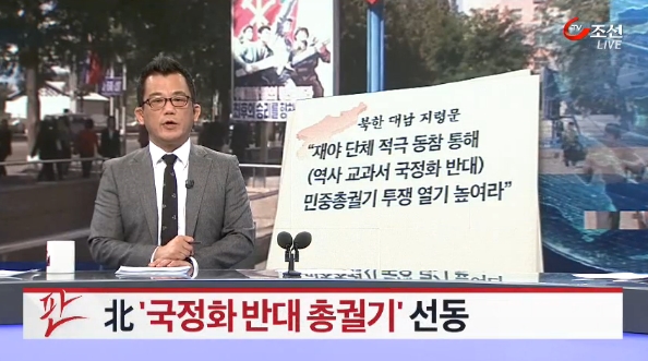 기존 교과서와 국정화에 반대하는 이들을 종북으로 몰려는 TV조선의 의도는 노골적으로 북한을 호출하는 보도에서 극명하게 드러난다. <“존엄 헐뜯었다”…북한 국정화 개입>(10/16, 9번째, 김정우 기자)에서 “북한은 ‘한국 각계층이 교과서 국정화를 저지, 파탄시키는 투쟁에 힘차게 나서야 한다’고 선동”했다며 국정화 반대 여론을 북한 선동과 연관 짓더니 10월 28일에도 <북 ‘국중화 반대 총궐기’ 선동>(10번째, 김정우 기자)에서 “북한이 국내외 친북단체에 역사교과서 국정화와 관련해 반정부 총력 투쟁을 선동하는 지령문을 보낸 것으로 알려졌습니다”라며 방송사 중 유일하게 문화일보의 ‘국정화 반대 투쟁 북한 지령문’ 단독을 받아 보도했다. 취재원도 불명확한 문화일보 보도의 부실함은 차치하더라도 공식적인 여론조사에서도 반대 53%, 찬성 36%(11/5, 한국갤럽)로 압도적인 국민의 반대 목소리를 모조리 북한 공작의 결과로 모는 국민 모독이다.