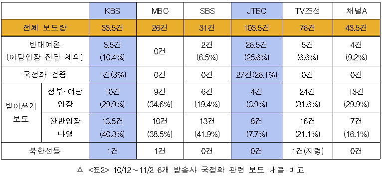 문제는 이렇게 비상식적 수준의 주장을 지상파 3사와 TV조선, 채널A가 그대로 받아쓰고 확대재생산 했다는 것이다. 이들은 한편 나날이 거세지는 시민, 학계, 교사, 청소년 및 대학생의 반대 목소리는 철저하게 외면했다. 국정화 행정예고 이후 11월 2일까지 20여 일간의 보도량을 상세 항목별로 보면 방송보도는 참담한 수준이다. 지상파 3사는 전체 보도의 70% 가량을 받아쓰기에 할애 했고 반대 여론과 국정 교과서 검증에는 무관심했다. 이는 TV조선과 채널A도 마찬가지이다. 두 언론은 받아쓰기에 50% 정도를 할애했고 검증에는 0건, 반대 여론에는 4~5건을 보도하는데 그쳤다. JTBC만이 검증과 반대여론에 비중을 두며 분석과 공정성 모두에서 고군분투했다.