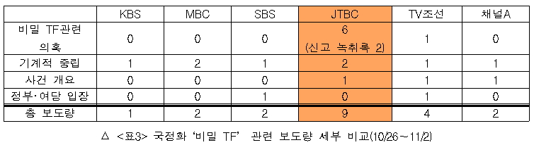 청와대가 행정예고 이전부터 여론을 선동하며 국정화를 비밀리에 추진했다는 사실을 드러낸 비밀TF에서도 방송사의 편향과 은폐는 고스란히 드러났다. 여기서도 JTBC 홀로 신고녹취록을 보도하는 등 언론다운 모습을 보였다. 타사는 기껏해야 기계적 중립을 지키며 사실상 침묵했다.