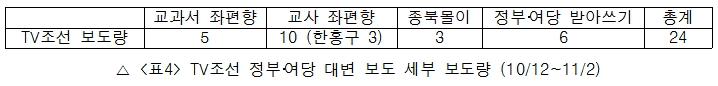 정부가 교과서 국정화를 행정예고한 10월 12일 이후 10월 한 달 간, TV조선의 보도는 편파보도 그 자체였다. 위의 <표2>에서 볼 수 있듯이 11월 2일까지의 보도에서 TV조선의 국정화 반대 여론 보도는 단 5건에 불과하고 국정화 검증은 단 한 건도 없다. 반면 정부‧여당의 입장을 대변하는 보도는 24건에 달한다.