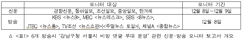 강남구청 서울시 비방 댓글 부대 운영 의혹 신문‧방송 보도 모니터 보고서(2015.12.9)