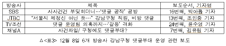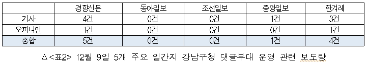 동아일보와 조선일보는 이와 관련해 단 한 건의 보도도 하지 않았다. 중앙일보는 <“강남구청 직원 서울시 비방댓글 200여 개”>(12/9, 20면)라는 단신 1건 보도에 그쳤다.