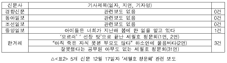 경향신문과 동아일보, 조선일보 17일자 지면에는 관련 보도가 한 건도 없었다. 한겨레는 총 3건을 보도했으며, 중앙일보는 세월호 청문회를 언급한 1건의 칼럼을 내놨다.