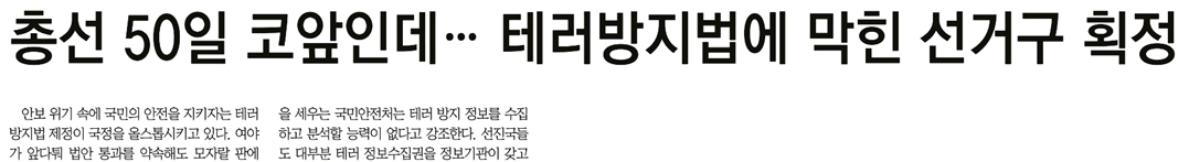 동아일보<총선 50일 코앞인데…테러방지법에 막힌 선거구 획정>(2/23, 3면, 이재명 기자, https://me2.do/5lUAIsAR)