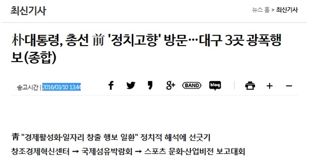 그런데 연합뉴스는 관련 기사의 제목을 <朴대통령, 총선 前 ‘정치고향’ 방문…대구 3곳 광폭행보(종합)>(3/10, 13:44, https://me2.do/xsxLfcFm)라고 뽑았다. 소제목은 청와대의 홍보문구를 그대로 받아쓴 것 같은 인상마저 준다. <靑 “경제활성화·일자리 창출 행보 일환” 정치적 해석에 선긋기>, <창조경제혁신센터 → 국제섬유박람회 → 스포츠 문화·산업비전 보고대회>라는 소제목은 박 대통령의 대구 방문이 경제활성화 및 일자리 창출 행보임을 분명히 드러내기 때문이다. 제목에부터 ‘경제활성화-일자리 창출’이라는 청와대의 주장을 앞세웠을 뿐, ‘선거법 위반’ 논란을 일으킬 수 있는 대통령의 부적절한 정치 행보에 대해서는 일언반구 비판적 언급이 없는 것이다.