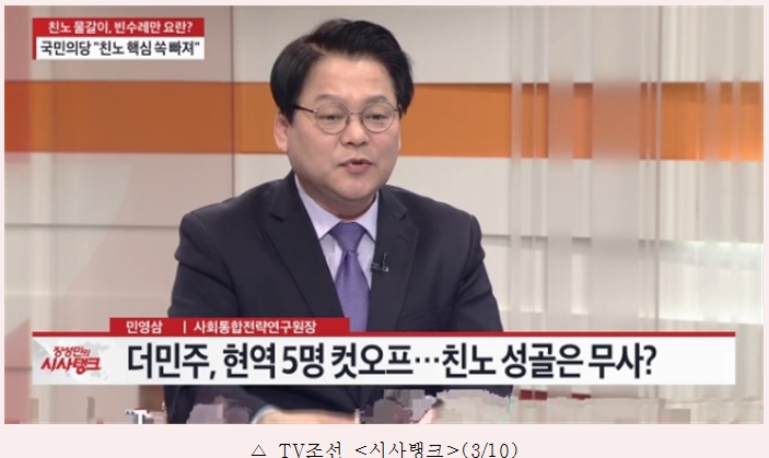 더불어민주당(이하 더민주)이 정청래 의원을 공천 탈락시키자, 3월 10일 TV조선 <시사탱크>에 출연한 민영삼 씨가 한 평가 발언이다. 민 씨는 정 의원은 ‘친문(문재인 계)’이 아니고 ‘정동영 계’라면서 더민주가 제대로 된 공천을 하고 않았다고 비판했다. 그러나 민 씨는 그동안 방송에서 정청래 의원을 반복적으로 언급하며 ‘친노 패권세력’으로 규정하는가 하면, 강력하게 공천에서 배제돼야한다고 주장했던 인물이다.