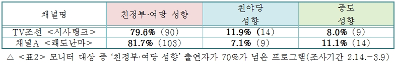 ■ TV조선 <시사탱크>, 채널A <쾌도난마> ‘친정부 여당 성향’ 80% 달해