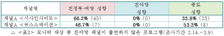 2차 분석기간 동안 채널A <뉴스스테이션>, <시사인사이드>는 '친 야당 성향'의 출연자를 단 한명도 출연시키기 않았다. 선거를 경기에 비유하자면, 중계석에 해설자와 특정 팀 응원단만 앉혀놓고, 편파적으로 경기를 중계해 시청자들에게 편향된 정보만 제공하고 있는 것이다.