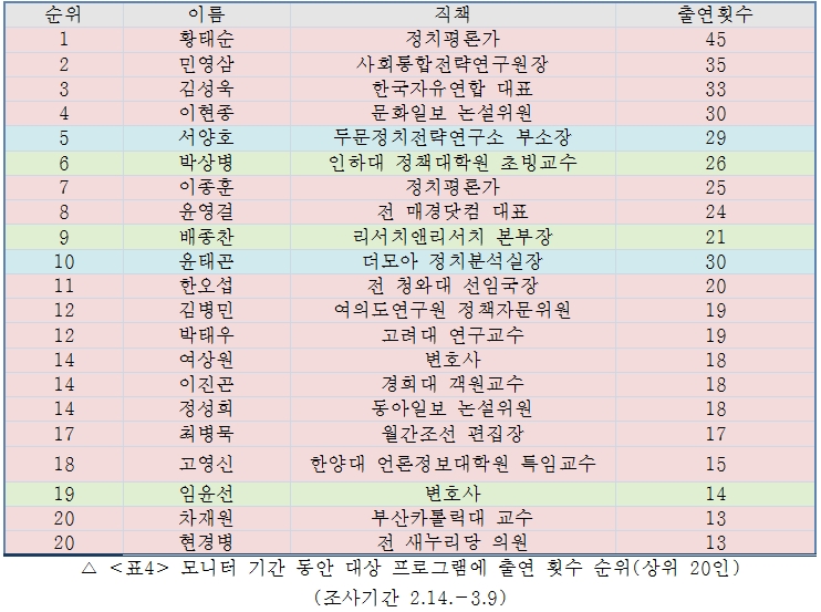 ■ 종편 단골 출연자 1위 황태순, 2위 민영삼, 3위 김성욱