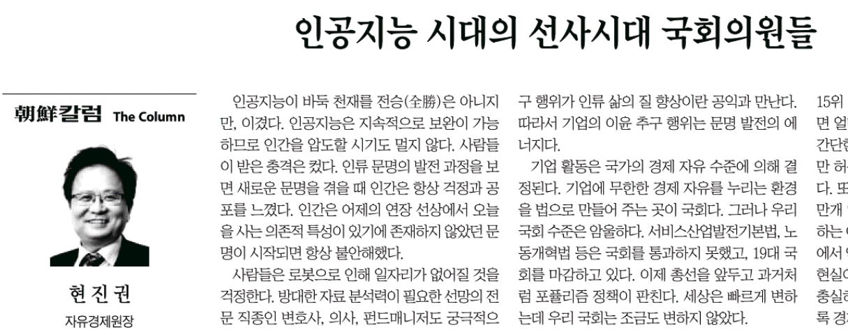 조선일보 <조선칼럼/인공지능 시대의 선사시대 국회의원들/현진권 자유경제원장>(3/16, 34면, https://me2.do/F6wXWX7M)