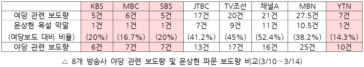 3월 10일부터 14일까지, 방송사의 여야 보도량을 보면, 새누리당에서 초유의 사태가 벌어졌음에도 KBS, MBC, SBS, YTN은 여당 관련 보도량이 야당 관련 보도량보다 적었다. 이 기간 야권에서는 더민주 컷오프와 야권연대 여부가 주요 사안이었다. 하지만 청와대까지 언급되는 여당의 ‘공천 암투’를 더 적게 다루는 태도는 사실상 사태를 축소하며 여당에 유리한 형국을 조성하는 것이나 다름없다.