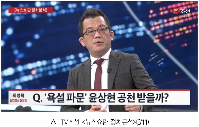 종편도 공천 개입 의혹을 피하며 사태를 제대로 다루지 않고 있다는 사실은 TV조선에서 극명하게 드러난다. 청와대 개입설을 제기했던 TV조선은, 11일 <뉴스쇼판 정치분석>(3/11, https://me2.do/xFkZmV82)에서 돌연 ‘물타기’를 시도하며 이중적인 태도를 보였다.