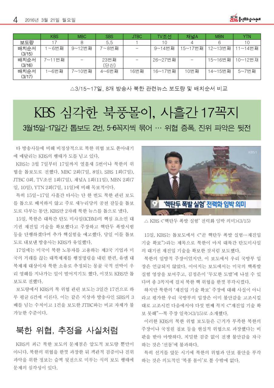 4. KBS 연일 ‘북풍’ 맹폭…또 북한 보도량 최다