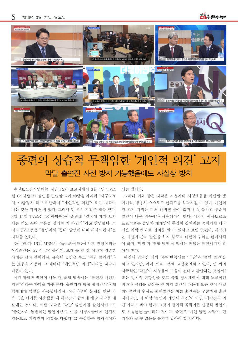[16차 주간보고서] "개인적인 의견"이 유행인가? 문제 발언 출연자 퇴출해야 외 PDF 파일(2016.3.7.)*pdf 파일로 다운 받아 보실수 있습니다.