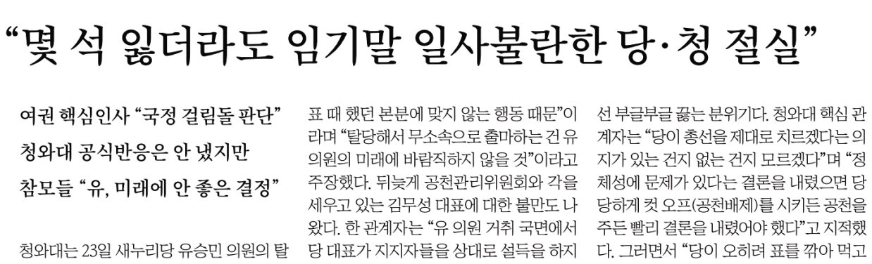 중앙일보는 <“몇 석 잃더라도 임기말 일사불란한 당청 절실”>(3/24, 3면, https://me2.do/x1ilcMEY)에서 청와대의 입장을 소개하는데 주력했다. “유 의원의 탈당이 관심거리가 되는 데 대해선 불편한 감정을 숨기지 않았다”며 익명을 요구한 한 청와대 참모의 “대통령과의 관계 악화는 유 의원이 원내대표 때 했던 본분에 맞지 않는 행동 때문”이라는 입장을 그대로 소개하는 식이었다. 이어 기사는 청와대 핵심 관계자의 “당이 총선을 제대로 치르겠다는 의지가 있는 건지 없는 건지 모르겠다”며 “정체성에 문제가 있다는 결론을 내렸으면 당당하게 컷오프(공천배제)를 시키든 공천을 주든 빨리 결론을 내렸어야 했다”, “당이 오히려 표를 깎아 먹고 있다”는 식의 발언도 그대로 소개했다. 반면 이한구 공천관리위원장과 친박계가 유 의원을 이렇게까지 배제하려는 것에 대해서는 “박근혜 대통령의 의지가 작용했을 수 있다”는 주장을 간략하게 소개하는 것에 그쳤다.