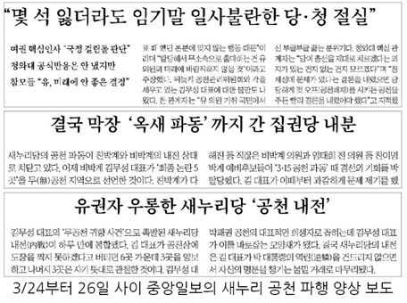 이처럼 사상초유의 집권 여당 공천 내홍이 발발하는 사이, 중앙일보는 노골적으로 청와대의 심기만을 살폈고, 조선일보는 새누리당과 정권에 대한 따뜻한 걱정의 마음을 숨기지 못했다. 동아일보는 여당도 야당도 모두 나쁘다며 양비론으로 문제를 희석하려 했다.