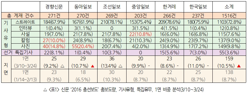 4‧13 총선 3월 10일(D-34)부터 D-20(3/24)까지 총 15일간 6개 신문의 선거관련 보도를 양적으로 분석했다. 선거관련 보도를 선택하는 기준은 직접적 선거 관련 보도와 직접 선거관련 소재가 아니더라도 보도의 제목과 소제목에서 선거와 연관되어 부각했거나, 한 단락 이상 사안을 선거와 연관시켜 영향을 분석한 경우 선거보도에 포함시켰다. 칼럼과 사설의 경우에도 명백하게 선거라는 단어를 사용하지 않아도, 선거에 영향을 주고자 하는 의도가 명백한 내용인 경우 선거관련 보도로 포함시켰다. 기간 중 선거관련 총 보도량은 1,516건이었다.(<표1>참조)