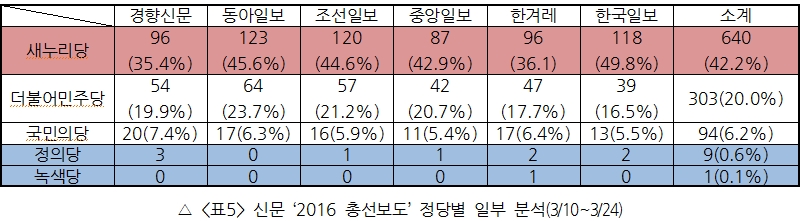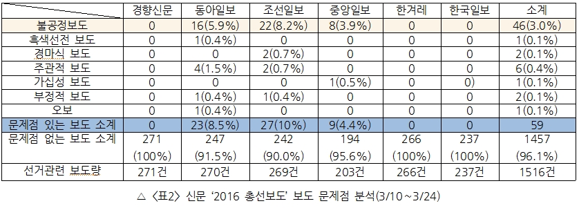 문제가 있는 보도로 지적된 기사를 표시한 <표2>를 보면, 신문에서 가장 두드러진 문제점은 ‘불공정 보도’였다. 문제가 있는 보도 59건 가운데 46건을 차지한다. 신문사별로 보면 조선일보가 22건(선거관련 보도량 대비 8.2%)으로 가장 많고, 동아일보가 16건(선거 관련 보도량 대비 5.9%), 중앙일보가 8건(선거 관련 보도량 대비 3.9%)이다. 경향, 한겨레와 한국일보의 경우 해당하는 기사가 없었다. 조선일보의 불공정 보도가 문제가 된 기사 22건 중에서 사설이 9건이었다. 조선일보의 사설 중 <형식적 물갈이 더민주 총선 뒤 다시 운동권黨 될 것>(3/11), <김한길·천정배의 沒염치 정치, 이젠 그만둘 때 됐다>(3/12), <원칙도 새 인물도 없이 舊態만 난무한 20대 총선 공천>(3/17)은 불공정 보도로 지적된 사례이다. 조선일보는 자신들의 끈질긴 요구로 성사된 정청래의 공천 배제를 칭찬하기는커녕 ‘형식적 물갈이’로 격하시키면서, 실체도 불분명한 “운동권 정당 청산”을 “중대한 정치 공약”이라고 의미부여하는 등 자의적인 기준으로 야당의 공천 과정을 해설했다. 한편 국민의당의 갈등 양상을 “국민을 역겹게 하는 정치”라고 지나치게 감정적인 반응을 보여 불공정 보도로 지적됐다. 언급된 정당만 보더라도 더민주에 대해 부정적 언급이 두드러졌다. <더민주 비례대표 진통, 운동권黨으로 돌아가자는 얘긴가>(3/21), <野 고질병 그대로 보여준 막장 비례대표 싸움>(3/22), <더민주, 김종인 대표 앞세워 국민 속였다>(3/23), <김종인 대표, 비례 5선 老慾에 물갈이 쇼 했나>(3/24)와 같이 매일 야당 선거 전략에 대한 부정적 견해를 부각했다.