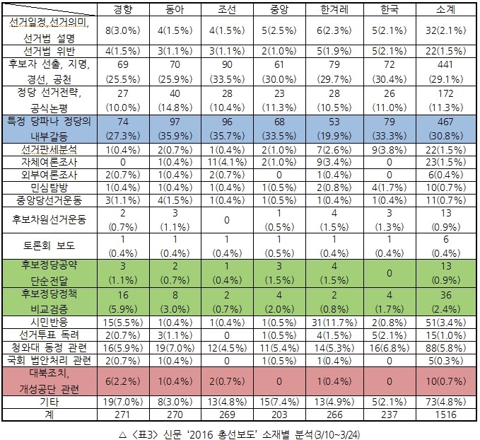 또한 이 기간 동안 청와대 동정 관련 기사가 88건(5.8%)으로 비중이 크다는 점도 특징이다. 선거에 대한 시민의 반응은 한겨레가 31건(11.7%)으로 타 매체에 비해 높았다는 점도 눈에 띈다. 한겨레는 선거 기획 보도 <20대 총선 청년이 말한다> 시리즈를 통해 대학생들의 목소리를 비중 있게 다뤘다. 또한 지역의 시민사회단체의 낙천․낙선운동과 장애인, 비정규직 등 소수자 문제, 탈핵, 토건 경제 반대 등 시민들의 요구 등을 다양하게 보도했다.