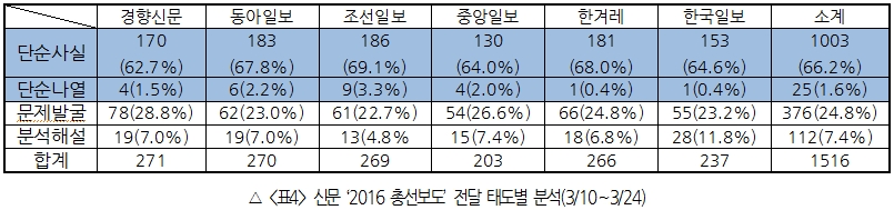 선거 관련 보도의 전달태도를 비교한 결과 단순사실과 단순나열 보도가 전체 1,028건(67.8%)을 차지했다. 반면 선거 관련 쟁점에서 문제점을 발굴, 지적한 보도는 376건(24.8%), 문제현상에 대한 자체 평가와 해설, 혹은 해결방안을 제시하는 분석해결 보도는 112건(7.4%)으로 나타났다. 15일 전과 비교하면 분석해설 보도가 두 배 늘었다. 그러나 단순사실과 단순나열 기사에 비하면 그 수가 여전히 적다