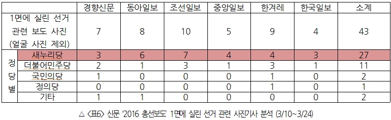분석 기간 중 1면에 선거 관련 사진이 실린 경우(작은 사이즈의 얼굴 프로필 사진은 제외)는 경향신문 7건, 동아일보 8건, 조선일보 10건, 중앙일보 5건, 한겨레 9건, 한국일보 4건이다. 한 사진에 여러명의 인물이 있을 경우, 주요한 2명의 경우로 카운팅을 한정했다. 그 결과 새누리당이 압도적으로 많은 양을 차지했다. 새누리당 소속 인물만 등장한 경우는 총 27건이었다. 유승민 의원이 7건, 김무성 대표 6건, 이한구 위원장 6건, 정종섭 의원 2건(박 대통령과 악수) 등으로 나타났다. 반면 더불어민주당은 김종인 대표 8건, 이해찬 의원 1건, 홍창선 위원장 1건이 전부였다.