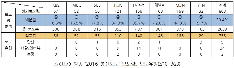 3월 10일(D-34일)부터 3월 23일(D-21일)까지 방송의 저녁종합뉴스에서 선거관련 내용이 빠진 요일은 전혀 없었다. 지상파 방송의 경우에도 하루 최소 2건 이상이 선거관련 리포트였다. 분석기간 동안 총선관련 보도는 총 803건(전체 2,639건 중 30.4%)이었다. (<표7>참조)