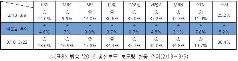 3월 10일(D-34일)부터 3월 23일(D-21일)까지 14일간의 8개 방송 저녁종합뉴스의 선거관련 보도를 양적으로 분석했다. YTN의 경우 3월 17일까지만 포함했다. 신문만큼 새누리당의 단독 리포트 독주가 시작됐고, 선거 격전지를 예상하면서 예상 득표수를 점쳐보는 판세분석이 정책이슈보다 부각되는 특징을 보였다. 전체적으로 선거구 획정과 정당별 후보 공천이 늦어지면서 정책 이슈 대결과 검증이 사라지고, 정당별 노출과 후보들의 개인 인지도에 따라 선거가 치러질 판이어서 이에 대한 각 채널별 개선 노력이 필요해 보인다.