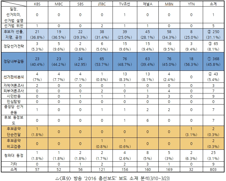 선거 관련 보도의 소재를 구분한 결과 방송도 정당 내부갈등 보도가 368건(45.8%)으로 가장 많고, 후보자 선출 및 지명과 관련한 보도가 250건(31.1%)으로 많았다. 그 다음으로, 정당선거전략 보도가 65건(8.1%)으로 나타났다. 정당 내부갈등 보도에 대한 쏠림 현상은 훨씬 증가하고 있는 추세인데다가 선거를 21일 앞둔 지금 후보자 선출과 지명에 관한 보도가 증가하면서 단순히 누가 선출될 가능성이 높을 것인가에 대한 판세분석이나 관전 포인트를 다룬 보도가 43건(5.4%)으로 크게 나타난 점이 문제점으로 보인다. 특히 1위 정당내부 갈등(45.8%)과 2위 후보자 선출‧지명‧공천‧경선(31.1%), 3위 정당 선거전략(8.1%), 4위 선거 판세분석(5.4%)을 모두 합하면 726건(90.4%)에 달한다. 이처럼 절대적으로 많은 보도가 정당의 움직임을 따라가는 보도인데 반해 정책 전달이나 검증보도는 거의 없었다.
