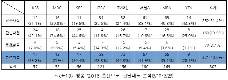 선거 관련 보도의 전달태도를 비교한 결과 분석해설 보도가 321건(40.0%)이었다. 그러나 여전히 정보를 특별한 가공 없이 그대로 전달하는 단순 전달 보도태도(단순하게 한 가지 사실을 전달한 보도)가 252건(31.4%), 단순 정보를 나열한 보도가 160건(19.9%)으로, 전체의 50.3%를 차지하고 있다.