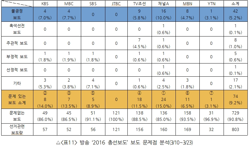 문제있는 보도를 선거관련 보도량의 백분율로 살펴보면 채널A가 24건(15.0%)으로 가장 많았고, 8건인 KBS가 14.0%, 7건인 MBC가 13.5%로 3번째 비중을 차지했다. 이는 선거 관련량 자체가 적었기 때문이다.