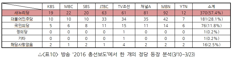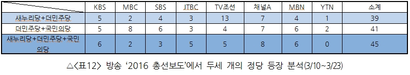 2개의 정당이 등장한 경우는 새누리당과 더민주가 함께 등장한 비중이 39건이고, 더민주와 국민의당이 같이 등장한 경우는 41건이었다. 새누리당과 더민주, 국민의당이 같이 언급된 보도는 45건이었다. 정당별 언급 비중만 보아도, 새누리당의 방송보도 빈도와 노출 정도가 압도적으로 우세함을 알 수 있고, 더민주는 새누리당의 절반 수준, 국민의당은 더민주의 절반 수준으로 방송에서 노출되고 있었다. 정의당과 녹색당, 그 외 소수 정당은 방송에서 노출될 빈도가 매우 희박했다.