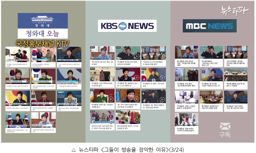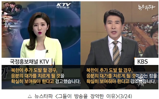 뉴스타파 최경영 기자는 국정홍보채널인 KTV와 KBS, MBC를 비교했다. KTV는 공무원들이 만든 말 그대로 ‘홍보물’인데, 공영방송인 KBS와 MBC가 그와 대동소이한 보도를 한다는 점을 꼬집어 공영방송들이 ‘정권의 나팔수’였음을 여실히 보여줬다.