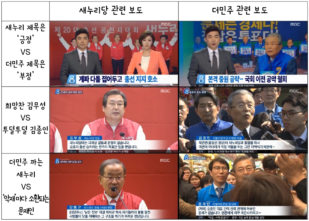 MBC 톱보도인 <계파 다툼 접어두고 총선지지 호소>(3/28, https://me2.do/FXhfADJp)는 새누리당 관련 보도, 두 번째 보도 <본격 중원 공략…국회 이전 공약 철회>(3/28, https://me2.do/GcgfTPdn)는 더민주 관련 보도였다. 그런데 두 정당 스케치의 내용을 비교해보면 극단적 편파성이 드러난다.
