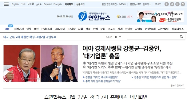 3월 29일 오후 7시 연합뉴스 홈페이지의 메인 최상단에는 <여야 경제사령탑 강봉균-김종인 '대기업론' 정면충돌>(3/29 17:43 https://me2.do/GJGIiwSW)보도가 게재되어 있다.