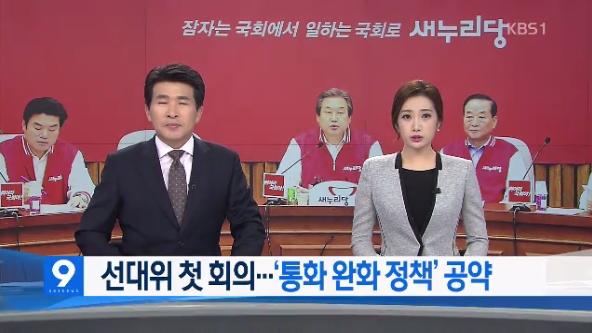 KBS <선대위 첫 회의…‘통화 완화 정책’ 공약>(3/29, https://me2.do/x9pfAXoI)는 “첫 선대위 회의에서 새누리당은 튼튼한 안보와 경제를 총선 화두로 야당심판론에 포문” “대통령 사진 반납 논란 등 무소속 후보와의 갈등은 자제” 등 새누리당의 첫 선대위 회의 풍경을 전했다. ‘공약 제시’와 ‘갈등 자제’와 같이 단합된 총선 체제에만 초점을 맞춘 것이다. 리포트 도중 “영남권 시도 선대위를 출범시키며 세몰이”라는 언급이 나왔지만 정작 ‘영남권 선대위’에서 나온 최경환, 조원진 의원의 ‘비박 겨냥’ 발언은 외면했다.