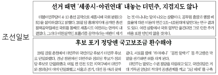 다음날 <사설/후보 포기 정당엔 국고보조금 환수해야>(3/30, https://me2.do/F0bdeWwS)에서는 더민주와 국민의당이 “언제 그랬냐는 듯 단일화 거래를 하는 것을 보면 희극을 하는 것 같다.… 주고받은 막말을 생각하면 혀를 차게 된다”고 비판한 뒤, “결국 두 정당 모두 독자 생존 자체가 힘든 당이라고 공언하는 셈”이라 강조했다. 이어 조선일보는 “생각이 달라 같이할 수 없다고 갈라섰다가 선거가 다가오자 후보라도 합치자는 것”은 “국민이 세금으로 지원해야 하는 정치 활동이 아니”기에 “선거보조금과 선거 관리 비용을 환수해야 한다”는 주장을 펼쳤다.