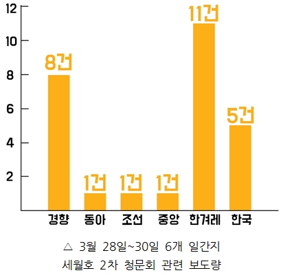 세월호 2차 청문회 관련 보도는 경향신문, 한겨레, 한국일보와 동아일보, 조선일보, 중앙일보로 그 양상이 뚜렷하게 갈린다. 단순 보도량만 봐도 한겨레가 11건으로 가장 많았고, 경향신문이 8건, 한국일보가 5건이었다. 반면 조중동은 모두 한 건씩의 보도만을 내놨으며, 이 중 조선일보의 경우 그 한 건의 보도조차 핵심 쟁점이 한 줄도 들어가 있지 않은 사진기사였다.