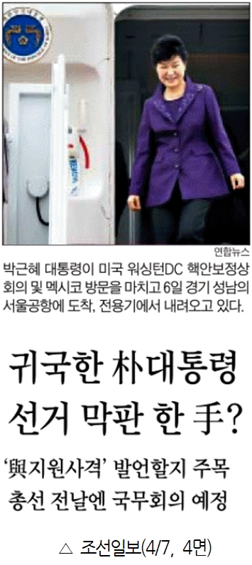 그러나 조선일보는 이와는 정 반대의 보도 태도를 보였다. <귀국한 박대통령, 선거 막판 한 수?>(4/7, 4면, https://me2.do/xlnakAXn)에서 조선일보는 “‘선거의 여왕’으로 불리는 박 대통령이 이번 선거와 관련해 어떤 메시지를 내놓을지가 관심”이라며 “문제는 대통령의 ‘지원 사격’이 새누리당에 얼마나 도움이 되느냐”라고 보도했다. 대통령의 선거 중립 의무 위반에 대한 우려나 지적은 하나도 없이 그저 ‘선거의 여왕’의 ‘지원 사격’ 효과만을 운운하고 있는 것이다.