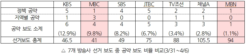 3월 31일부터 4월 6일까지, 7일간 7개 방송사의 공약 보도를 산정한 결과, 참담한 수치가 나왔다. 일주일간 6건을 보도한 KBS가 공약 보도에 가장 적극적이었고 MBN은 단 1건에 그쳤다. 공약 보도 산정에서 ‘경제 심판론’ ‘야권 심판론’ 등 당 차원의 구호 관련 보도는 제외했다.