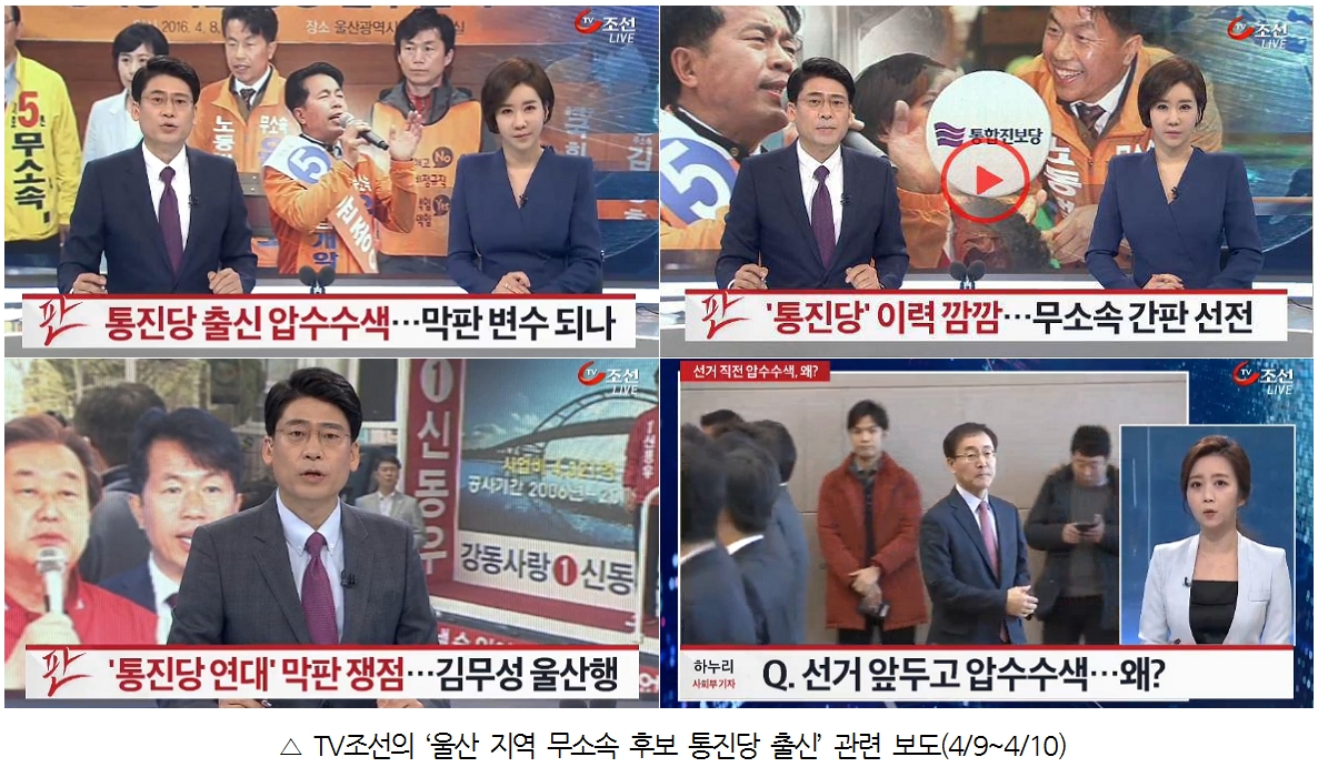 TV조선은 9일과 10일 보도에서 반복적으로 울산의 두 무소속 후보가 ‘통진당 출신’을 숨겼다며 왜곡하고 있는데 이는 김무성 새누리당 대표의 ‘위장 출마’ 주장을 옮긴 것이다. <‘통진당’ 이력 깜깜…무소속 간판 선전>(4/9, https://me2.do/FnNQ4V4v)은 “두 후보 모두 통진당 출신임을 알리지 않고, 무소속으로 출마” “두 후보가 공개한 이력에선 통진당의 흔적을 찾아보기 어렵습니다”라며 울산의 무소속 후보 두 명이 의도적으로 통진당 이력을 숨겼다는 듯 보도했다. 이어서 “스스로도 통진당이 국민 앞에 내세우기가 껄끄럽다, 자신이 없다는 거죠”라는 유동열 자유민주연구원장의 인터뷰를 덧붙였다. 하지만 두 후보의 정당 이력은 중앙선관위 홈페이지를 통해 볼 수 있다. 유동열 원장은 통진당 해산 심판 당시 정부 측 참고인이었으며 TV조선과 채널A의 시사토크쇼에서 갖가지 망언과 막말을 쏟아내는 인물이다. 이 보도에서는 윤종오 후보에 대한 검찰의 압수수색을 설명하면서 윤 후보와 전혀 관련이 없는 선관위의 현장 조사 장면을 화면으로 내보내기도 했는데 현재 TV조선 누리집에서 이 보도는 삭제된 상태이다.