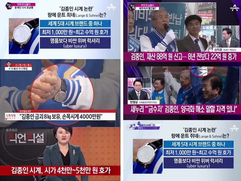 4월 11일 채널A <뉴스특급>에서는 시계의 상표를 언급하며 자세히 설명한 뒤, 독일 친구에게 선물로 받았다는 김 대표의 해명이 거짓인 양 몰아갔다. 출연자 이현종 씨는 “독일 사람들은 굉장히 검소해서 이런 걸 쉽게 주지 않는다"며 "워낙 친분이 두터우신 분이라 그런 건지 모르겠다”고 언급했다. 신지호 씨도 “독일 사람들이 검약하기로 세계에서 아주 유명한 사람들”이라며 “암만 친하다고 해도 어떻게 4천만 원짜리를 주냐”며 해명이 부족하다고 맞장구쳤다. 이런 대화를 나누는 동안 화면에는 시계를 찬 김종인 대표의 모습과 시계 상표와 가격 등을 상세히 적은 자료화면이 나왔다.