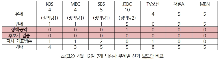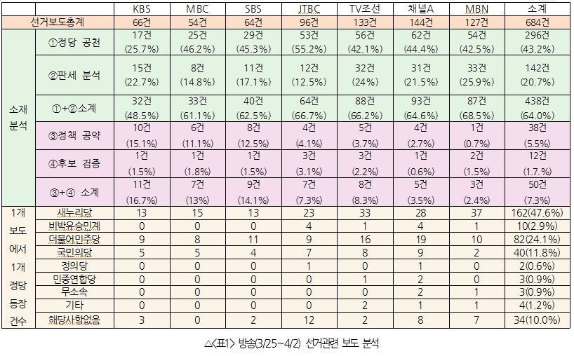 총선보도감시연대는 3월 24일부터 4월 2일까지의 선거보도 양적분석(4/8, https://me2.do/GmQ2dnMg)에서 정책, 후보자 검증, 군소정당이 사라졌음을 지적한 바 있다. 선거가 20일에서 11일 남은 시기였음에도 불구하고, 선거보도의 대부분이 정당 공천 관련와 판세 분석 관련 보도였다. 정당공천은 특정 당파나 정당의 내부갈등, 후보자 선출, 지명, 경선, 공천, 정당 선거전략을 포함한 것이고, 판세분석은 선거 판세분석, 여론조사, 민심탐방, 시민반응을 포함한 것이다. 정당공천과 판세분석 보도를 합한 수치를 보면 KBS(32건, 48.5%)가 가장 낮은 비율이고, 전체적으로 모두 60%를 넘는다. 반면 정책공약과 후보검증 보도를 합해도 총 7.3% 정도였고, MBN은 3건(2.4%)에 불과한 황당한 경우도 있었다. 정책공약은 정책단순전달과 검증보도이고, 후보검증은 후보자 검증보도와 토론회 보도를 포함한 것이다. 선거가 임박한 시기라는 점을 감안하면 더욱 이런 수치는 심각하다. 선거보도 대부분이 정당 공천과정과 내부분열, 여론조사, 판세분석 등으로 일관했다는 뜻이기 때문이다.