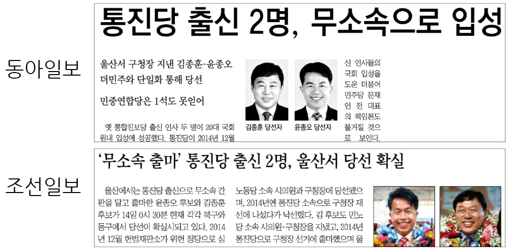 조선일보는 <무소속 출마 통진당 출신 2명, 울산서 당선 확실>(4/14, 16면, https://me2.do/GM79DvqA)에서 “2014년 12월 헌법재판소가 위헌 정당으로 심판한 통진당 출신 후보들이 불과 1년 4개월여 만에 지역구 선거를 통해 20대 국회에 들어오는 것”이며 “이 두 사람은 이번 총선에서 통진당 경력을 거의 드러내지 않았다”고 지적했다. 이어 “더불어민주당 후보가 사퇴하면서 자신들이 '야권 단일 후보'가 됐음을 적극 내세웠다”, “문재인 전 대표가 지난달 단일화 중재를 위해 울산을 방문했고, 북구에 출마했던 더민주 이상헌 예비 후보는 …스스로 물러났다. 동구에서는 이틀 뒤(25일) 더민주 이수영 후보가 사퇴했다”며 동아일보만큼 노골적이진 않지만, 이들의 원내 입성이 모두 문 전 대표의 행보와 연관된 것임을 강조했다.
